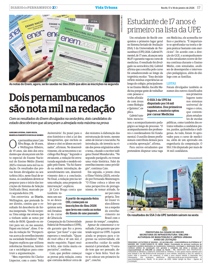 - Diário de Pernambuco - Dois pernambucanos são nota mil na redação