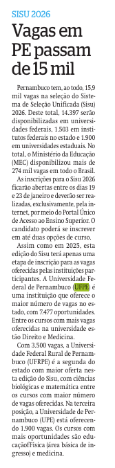 Pernambuco tem, ao todo, 15,9 mil vagas na seleção do Sistema de Seleção Unificada (Sisu) 2026. Deste total, 14.397 serão disponibilizadas em universidades federais, 1.503 em institutos federais no estado e 1.900 em universidades estaduais. No total, o Ministério da Educação (MEC) disponibilizou mais de 274 mil vagas em todo o Brasil.