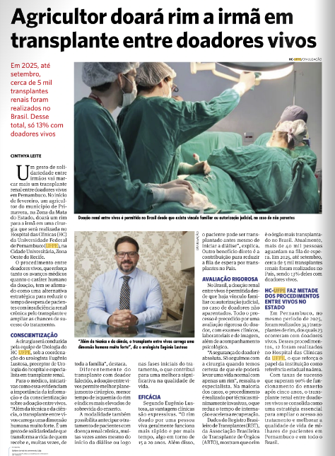 - Jornal do Commercio- Agricultor doará rim a irmã em transplante entre doadores vivos