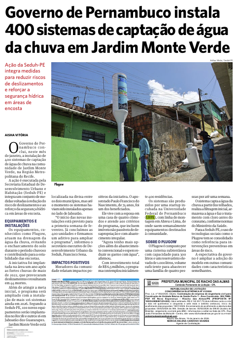 Jornal do Commercio- Governo de Pernambuco instala 400 sistemas de captação de água da chuva em Jardim Monte Verde