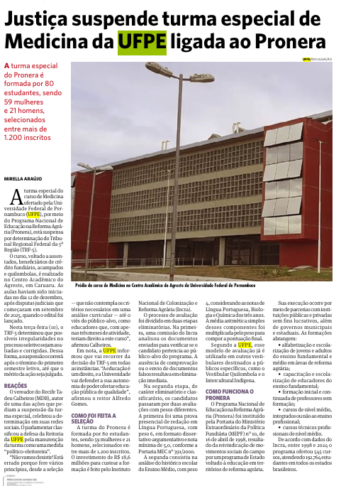 - Jornal do Commercio- Justiça suspende turma especial de Medicina da UFPE ligada ao Pronera