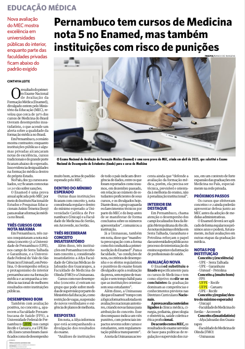 - Jornal do Commercio- Pernambuco tem cursos de Medicina nota 5 no Enamed, mas também instituições com risco de punições