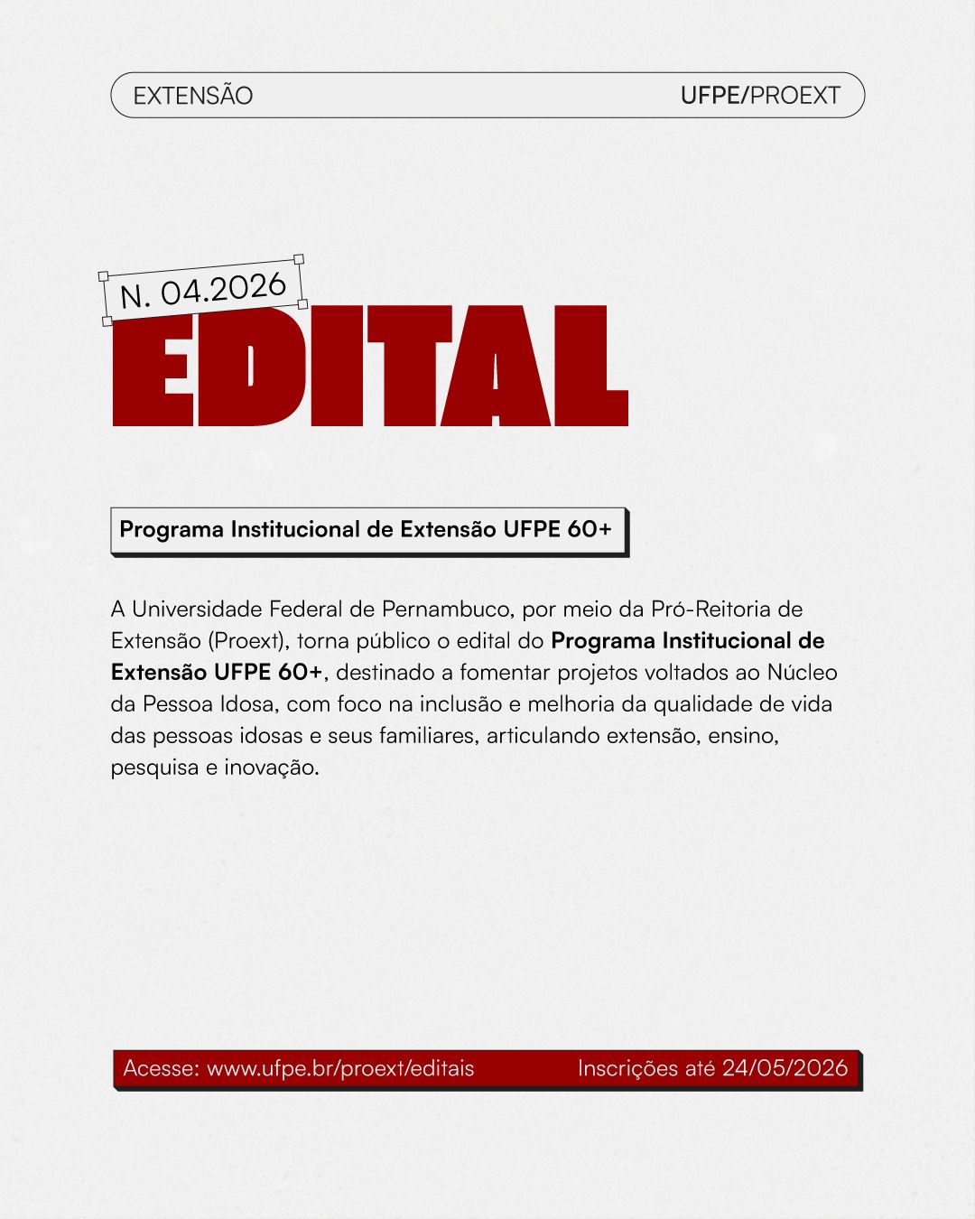 A Universidade Federal de Pernambuco, por meio da Pró-Reitoria de Extensão (Proext), torna público o edital do Programa Institucional de Extensão UFPE 60+, destinado a fomentar projetos voltados ao Núcleo da Pessoa Idosa, com foco na inclusão e melhoria da qualidade de vida das pessoas idosas e seus familiares, articulando extensão, ensino, pesquisa e inovação.