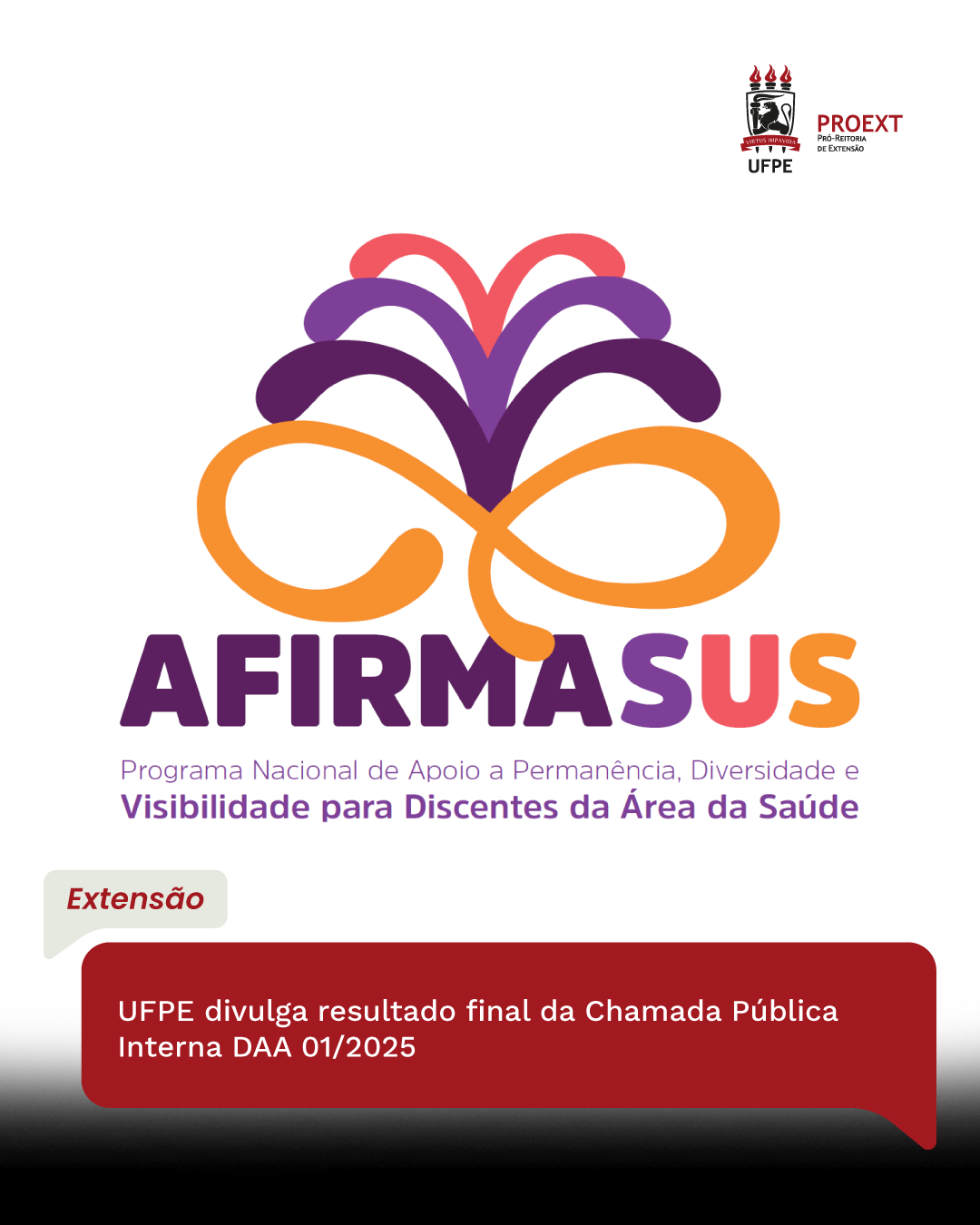 A Universidade Federal de Pernambuco (UFPE), por meio da Diretoria de Ações Afirmativas (DAA), em parceria com a Pró-Reitoria de Extensão (Proext), a Superintendência de Cultura (Supercult) e a Pró-Reitoria para Assuntos Estudantis (PROAES), torna público o resultado final da Chamada Pública Interna DAA 01/2025.